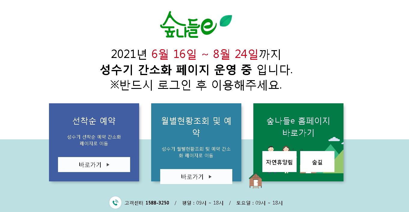 현재 숲나들e 홈페이지 같은 경우는 성수기를 맞이하여 간소화 페이지가 운영 중입니다. 선착순 예약, 월별 현황조회 및 예약, 숲나들e 홈페이지 바로가기로 구분되어 접속을 할 수 있습니다.